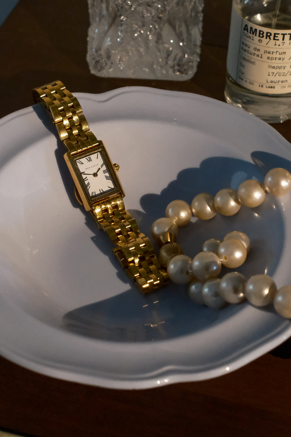 A symbol of anticipation and unforgettable moments in this women's gold rectangular watch.